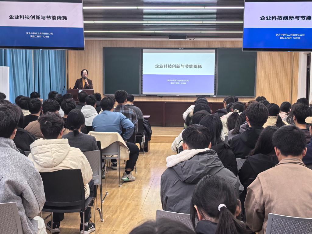 11月18日下午,应我院邀请,新乡中新化工有限责任公司技术研发中心主任文培娜高级工程师为2025级化学工程与工艺专业学生作了一场题为《企业科技创新与节能降耗》的专题报告。本次报告旨在通过企业真实案例,帮助新生深入了解化工行业的前沿技术、创新实践及可持续发展理念,为他们的专业学习注入实践动力。
