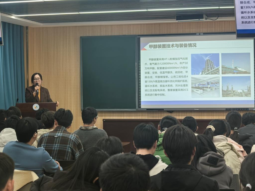 文培娜在报告中详细介绍了公司主要产品生产工艺路线。甲醇装置采用HT-L粉煤加压气化技术,制气能力达120000 Nm³/h,配套空分、变换、低温甲醇洗等系统;乙二醇装置利用非石油工艺路线,通过羰基化、加氢两步法生产聚酯级乙二醇,是世界第二套工业化煤制乙二醇项目。这些内容为新生们勾勒出现代化工生产的宏观框架。